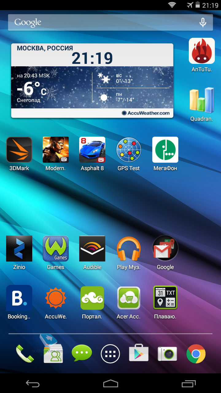 Переходим к самому неоднозначному параметру этой модели. Напоминаю, что стоит Talk S 15000 рублей, при этом дисплей имеет только HD-разрешение. На мой взгляд, это существенный недостаток. Лично я вижу разницу между HD и FHD невооруженным глазом. Проявляется она прежде всего в зернистости мелких шрифтов. С другой стороны, при просмотре видео особых преимуществ у FHD на такой диагонали нет. У дисплея хорошие углы обзора, неплохой диапазон максимальной/минимальной яркости и посредственное поведение на солнце. Экран в этом планшете уступает конкурентам, прежде всего разрешением, и это один из главных недостатков аппарата. Из интересных особенностей отмечу возможность быстрой разблокировки экрана с помощью двойного нажатия. Кроме того, на это нажатие можно закрепить запуск любых приложений. Простая и удобная функция (вот только перевод на русский никак не доработают). Операционная системаПланшет работает под управлением Android 4.4.4 с небольшими изменениями от Acer. Производитель обещает апдейт данной модели до Android 5.0 (информации по срокам на данный момент нет). Среди добавлений выделю появление ярлыков на экране блокировки (правда, они не настраиваются, что минус). Небольшое изменение шторки с переключателями. И плавающие виджеты. Это небольшое окошко с календарем, калькулятором, картами или заметками. В остальном же, перед нами «чистый» Android 4.4 KitKat со всеми его плюсами и минусами. Кстати, при покупке этого планшета вам дарят 10 ГБ в Dropbox, вот, правда, сроком всего на 3 месяца. Производительность