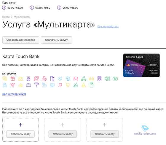 Android Впрочем, интерфейс приложения довольно понятный, а функциональность на уровне домашнего интернет-банка, просто нужно поработать над его качеством. ТехподдержкаИспользуя карту Touch Bank, я видел, как много они позаимствовали у Тинькофф Банка, начиная от метода работы и заканчивая недавно начавшимся марафоном. Но есть одна особенность Тинькофф Банка, которую Touch Bank так и не реализовал. Речь, конечно же, о прекрасной техподдержке. Я несколько раз звонил в поддержку TB и, прежде чем перейти к оператору, должен был выслушивать долгий автоответчик с кучей вариантов выбора, при этом нельзя было нажать «0», чтобы перейти к живому оператору. После этого пришлось еще минут семь висеть на линии в ожидании свободного специалиста. Поддержка в соцсетях также хромает, всё, что может сказать их представитель, — звоните в наш колл-центр. Кстати, я как-то обращался банк с помощью обратной связи интернет-банкинга, и вот там довольно оперативно ответили, более того, продублировали ответ SMS-сообщением. Карта в картеИнтересная функция, которую я ранее не встречал ни в одном из банков. Вы можете привязать к карте Touch Bank до пяти своих карт и настроить правила их использования при оплате той или иной услуги. Например, при покупке авиабилетов используется карта All Airlines, в аптеках — черная Black, а в ресторанах – собственный счет карты Touch Bank. Если честно, я не совсем понимаю, какая выгода банку от этой функции, но работает она на удивление хорошо. БезопасностьУ карты широкие возможности по настройке лимитов на те или иные операции: вы можете изменить не только месячный и дневной лимиты, но также ограничить покупки за рубежом или по кредитному лимиту.