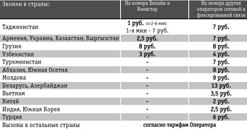 Специальные цены на международную связь в табличке ниже.