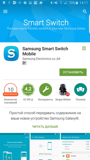 Обратил внимание, что количество загрузок приложения явно отстает от количества комментариев. Но не беда. Интересно, что и в этой области Apple повторяет то, что уже сделали другие компании. Хотя в этот раз компания даже не писала приложение самостоятельно, а купила права на чужую разработку, немного причесав ее под себя, вот тут раскопали, что за приложение Apple продвигает под своей маркой. Приложение «Миграция» на телефонах Motorola или Samsung Smart Switch, которое умеет отлично переносить данные как с iOS, так и с любого Android-устройства. И количество загрузок этого приложения в Google Play Store – уже больше 10 миллионов, оценки также на высоком уровне (основной канал распространения приложения – это Samsung APP Store).