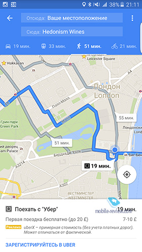 Все эти меры направлены на защиту обычных кэбов лондонского такси. Сегодня ситуация такова, что стоимость поездки в кэбе в два раза больше, чем с использованием Uber. У меня была возможность сравнить их на практике, и результат не только по стоимости, но и по удобству на стороне Uber. Начну с того, что в Лондоне машин, работающих в Uber, очень много. Время от заказа машины в приложении до ее подачи укладывается в пять минут. Для тех, кто использует машину впервые, дается кредит в 20 фунтов (на одну поездку). Такая реклама очень неплоха, добавлю также, что Uber покупает рекламу в Google Maps, и при прокладывании маршрута вам показывают значок Uber и предлагают заказать поездку.