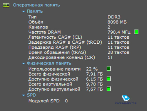 Как уже было ранее сказано, аппарат оснащен чипом и антенной NFC. За время тестирования никаких сбоев не наблюдалось: интернет по Wi-Fi стабильно «доходил» до планшета, а мышка по Bluetooth функционировала без проблем. ПамятьВ нашей модели используется 8 ГБ оперативной памяти DDR3 (двухканальная, 1600 МГц). Система выставляет 7.4 балла.
