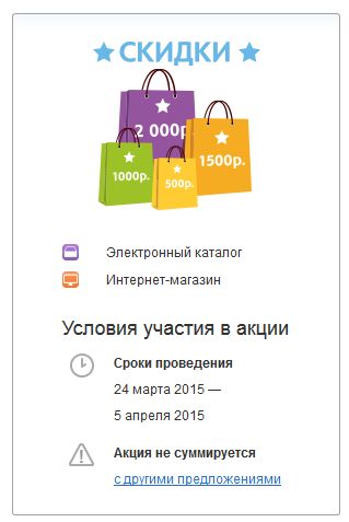 Также вновь можно получить скидку на будущую покупку. Есть список товаров, которые, будучи купленными в период между 24 марта и 5 апреля, позволят сэкономить на следующей покупке в «Связном» от 500 до 2000 рублей. Не густо, но надо учесть еще момент того, что срок реализации бонусов ограничен (8-30 апреля, но не ранее 15 суток с момента предыдущей), а максимальный размер скидки не должен превысить 30% стоимости товара. В общем, нечто странное. Условия писались тем, кто либо не думал, либо думал о том, чтобы как можно меньшее число покупателей реально смогли воспользоваться предложением. ЮлмартС 20 по 31 марта в «Юлмарте» проходит акция «Cнимаем все лишнее». Заявленный максимальный размер скидки — 50% стоимости товара. В каталог скидок попали все группы товаров гипермаркета, начиная от садового инвентаря. Если говорить об электронике, то наиболее распространенным размером скидки станет одна-две тысячи рублей. Так что в большинстве случаев это будет не выгодное предложение, а что-то в пределах наиболее типичной цены для крупных сетей. Так что, если где-то и есть половинное уменьшение цены, то точно не в разделах ноутбуков, телевизоров и смартфонов — размер скидки в процентах для большинства товаров не превысит 5%. А наиболее выгодные реально составят до 10%. В общем, вроде как весенняя акция и есть, но заметна она разве что в отчетах менеджеров, а никак не для покупателей. Ну, если только вы не покупаете какой-нибудь расходник, вроде картриджа для принтера.