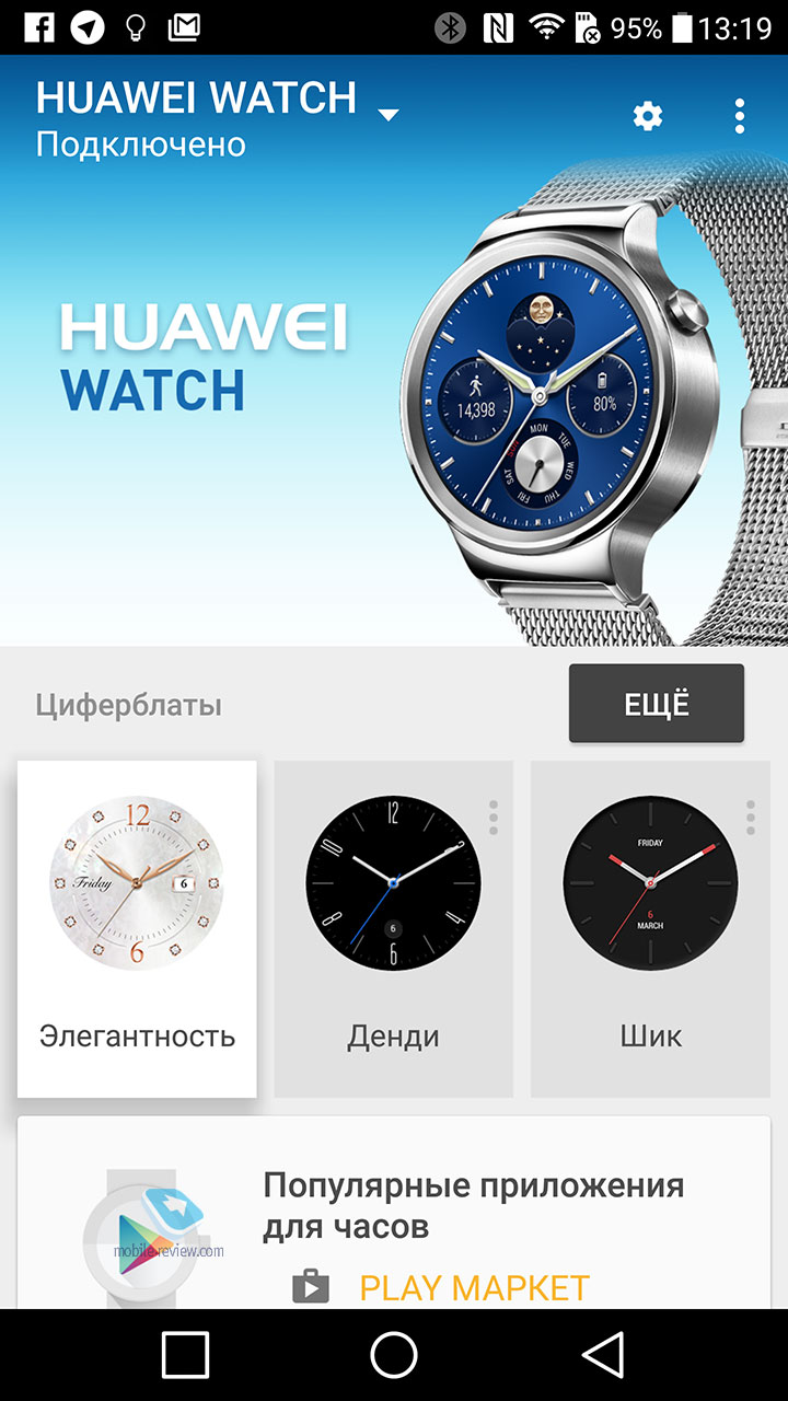 По своим возможностям Huawei Watch – типичные умные часы текущего поколения на базе Android Wear. Первое их «умение» – собственно, наручные часы, показывающие время. При этом вы можете выбрать один из нескольких сотен (базово доступно около 30-40) циферблатов, чтобы видеть не только время в аналоговом или цифровом формате, но и другие данные, от дня недели и погоды до сводок новостей и так далее. Есть различные тематические циферблаты, делающие часы похожими на терминал из Fallout, детскую игрушку и так далее. Вариантов очень много, и выбор действительно большой.