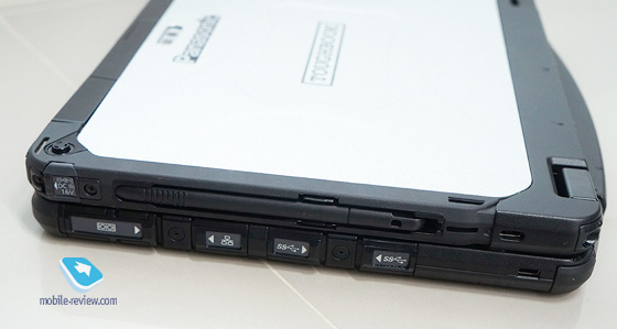 В Panasonic не поскупились на порты: тут вам и 3хUSB 3.0, и отдельные HDMI как на доке, так и на планшете, и целых два Ethernet-порта, и два слота для карт памяти различного формата. Все они прикрыты защитными заглушками, чтобы не пострадать во время активного использования планшета. Когда смотришь на торцы Toughbook, то он кажется еще более брутальным, обратите внимание на фото ниже.