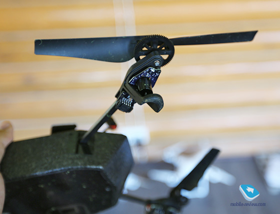 В отличие от того же DJI, в Parrot сделали ставку на модульную конструкцию, в квадрокоптере можно заменить каждый компонент, купить его отдельно, как оригинальный, так и от сторонних производителей. Пожалуй, по числу разных вариаций компонентов AR.Drone сегодня остается лидером на рынке, их можно найти на любой вкус. И это сильная сторона устройства. Каждый двигатель имеет свой индикатор, при включении батареи они начинают работать, включается светодиод. Защита от влаги реализована хорошо, можно падать в мокрую траву и даже в лужи, хотя последнее не рекомендуется, можно повредить электронику. Но несмотря на простоту конструкции, она надежная. Моторов четыре, скорость вращения – 28500 оборотов в минуту. Обычной батареи на 1000 мАч хватает примерно на 10 минут полета, а вот батарея увеличенной емкости, в теории, дает 18 минут. Отсюда надпись на коробке – 36 минут полета. Это своего рода маркетинговый трюк, так как требуется замена батареи, но учитывая, что их две, а дальность полета минимальна, это не составит труда.