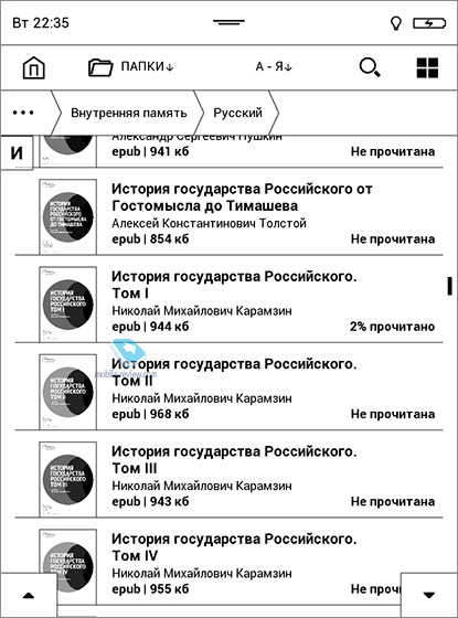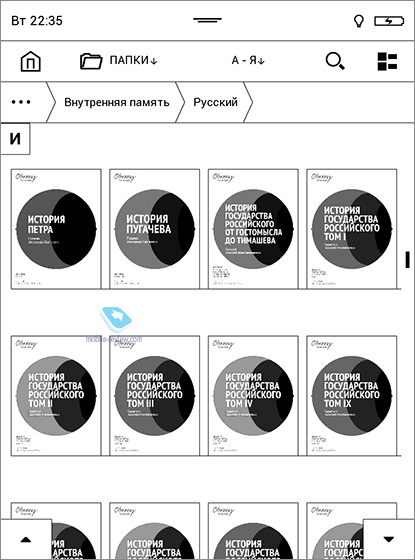 В «библиотеке» есть разбиение книг по папкам, вы вольны сделать любое их количество в памяти устройства, и здесь они будут отображаться по алфавиту. Внутри папок - уже книги. Для каждой книги отображаются обложка (если есть), название и автор, а также формат и размер книжки.