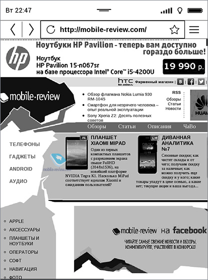 ДисплейВ PocketBook 630 Fashion используется e-ink дисплей нового поколения – E Ink® Pearl. В случае с PocketBook 630 Fashion используется дисплей с диагональю 6'' и разрешением 1024x758 точек с подсветкой и датчиком освещения. Экран сенсорный, емкостного типа. Экран отличный, это именно то, за что книжке можно простить некоторые недостатки. Даже при выборе очень мелкого шрифта он остается аккуратным и гладким, есть хороший запас яркости подсветки, дисплей прекрасно читается на солнце, а изображение не искажается, даже если отклонять устройство. У экрана яркая, равномерная подсветка с возможностью ручной настройки. Также здесь предусмотрена автоматическая регулировка яркости подсветки, для этого над экраном есть небольшой датчик освещения. Система автоматической настройки подсветки работает, если я все корректно проверил, от выбранной позиции яркости. То есть вы выставляете какой-то определенный уровень, и плюс-минус от него яркость будет варьироваться, когда выбран режим «АВТО». Это значит, что автомат не выкрутит яркость на максимум, когда ползунок у вас находится в левой (минимальной) области.