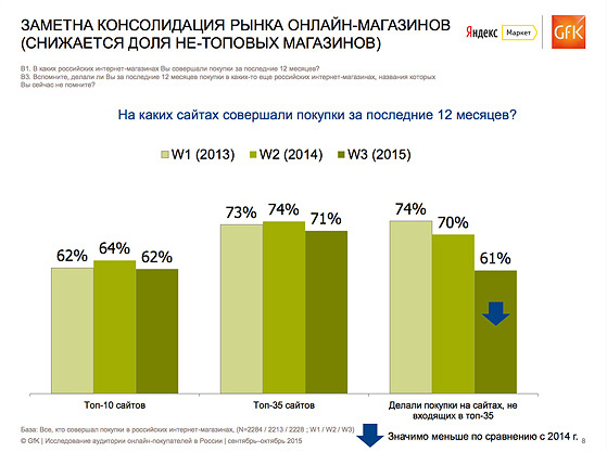 Яндекс.Маркет. Изменения рынка за 15 летЯ очень люблю, когда онлайн-сервисы организовывают подобные мероприятия с демонстрацией подробной инфографики, при взгляде на которую сразу понятно, что изменилось за последний год в сравнении с прошлым. К сожалению, такие мероприятия проходят буквально пару раз в год, впрочем, чаще они и не нужны. Отчет GFKПрезентацию начали, в общем-то, с очевидного факта — в кризис индекс потребительских настроений традиционно падает, люди стараются экономить и реже радовать себя какими-либо покупками. И это справедливо для офлайн-розницы, а вот покупки в онлайн-магазинах, наоборот, растут. Во многом это связано с популярностью иностранных магазинов. Обратите внимание, что наибольший рост онлайн-покупок наблюдается для магазинов в собственном городе и китайских онлайн-гипермаркетов вроде AliExpress. Оно и понятно, во время кризиса народ всё чаще смотрит на более дешевые гаджеты и вещи. И, естественно, находит их в китайских интернет-магазинах. Интересно, что первые три популярные категории товаров - одежда и обувь, товары для детей и косметика/парфюмерия, а смартфоны и бытовая техника находятся только на четвертом и пятом местах. Для косметики и бытовой техники доля заказов в иностранных магазинах значительно ниже, что неудивительно, ведь первые товары, как правило, крупногабаритные, а заказывать косметику Бог знает откуда согласятся немногие. К слову, это же касается компьютеров и ноутбуков, видно, что народ пока не доверяет китайским магазинам подобные дорогие покупки. Интересно было посмотреть на причины покупки в иностранных магазинах. Помимо самой логичной из них в виде низких цен, покупатели также выделили более широкий ассортимент и наличие товаров, официально не продающихся в России. Российские же онлайн-магазины сравнили с офлайн-ритейлом. Ситуация вышла такая же, как и на прошлом слайде: в онлайне больше выбор, дешевле, да и просто это быстрее. В GFK заметили, что в этом году внимание покупателей концентировалось в большей степени на крупных магазинах, нежели на мелких. Я могу понять подобное поведение, ведь сам предпочитаю покупать нужную технику в крупных сетевых гипермаркетах, основная причина - это, конечно же, доверие и надежда на более качественное обслуживание в случае проблем с товаром. Обратите внимание на то, как распределились доли любимых магазинов среди опрошенных покупателей. С большим отрывом лидирует OZON, а второе место почти поровну делят "Эльдорадо", "Юлмарт" и "МВидео". К слову, сам я в последних трех магазинах обычно и закупаюсь (а еще в "Ситилинке"). Традиционно рассказали и про пользователей мобильных версий сайтов или специальных приложений от интернет-магазинов. Лично я пока не совсем понимаю их идею, мне куда удобнее сделать заказ за большим экраном своего компьютера. Заметьте, что чем старше человек, тем чаще он использует именно сайт магазина, а не приложение. Поинтересовались у покупателей и местами, в которых те совершают покупки. Интересно, что в регионах доля людей, совершивших покупки в транспорте, на 5% выше, чем в Москве. Вообще, тот же автобус или метро - это отличное время для шоппинга: едешь на работу, а заодно присматриваешь новый внешний аккумулятор. А вот проблемы, с которыми столкнулись любители совершать покупки со смартфона. Помимо известного недостатка в виде м