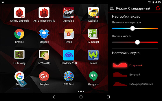 Экран в Predator 8 просто замечательный: яркая четкая картинка, отсутствие воздушной прослойки, максимальные углы обзора и большой диапазон по яркости. В настройках вы можете выбрать один из нескольких режимов отображения картинки, есть даже специальный игровой режим. Мне он, если честно, не очень понравился, картинка становилась пересвеченной. Операционная системаВ планшете установлен старый добрый Android 5.0.2 с несколькими фирменными дополнениями от производителя. Обзор самой операционной системы вы можете прочесть по ссылке ниже, сейчас же обсудим особенности, добавленные Acer. Во-первых, производитель изменил шторку уведомлений, мне это нововведение не очень понравилось, впрочем, это вопрос вкуса. Во-вторых, добавился дополнительный левый экран с новостями, аналогичное решение используется в HTC Blinkfeed. В-третьих, вы можете использовать двухоконный режим, работает он, правда, с ограниченным количеством приложений. В-четвертых, включать дисплей можно с помощью двойного тапа по выключенному экрану, а делать скриншоты — щипком тремя пальцами. С помощью технологии Bluelight Shield доступна смена баланса белого в сторону теплых тонов, подобная надстройка позволяет снизить нагрузку на глаза при работе с текстом. Производительность