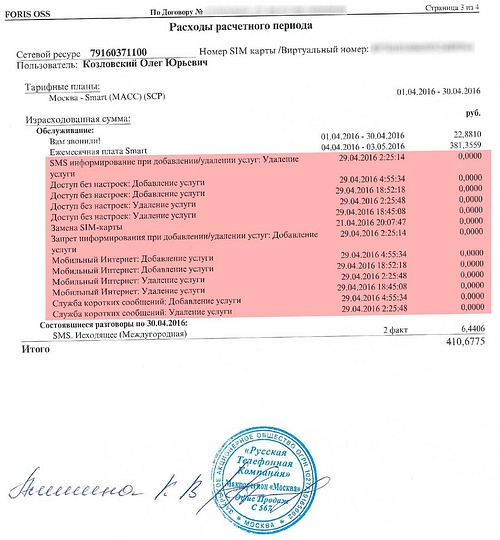 Версия 1Гипотеза взлома через СОРМ (Система оперативно-розыскных мероприятий). Традиционно наша оппозиция любые свои горести и передряги объявляет происками спецслужб, но мы постараемся не обсуждать политику. Версия правдоподобна? На мой взгляд, не очень. СОРМ, конечно, никто не отменял, но эта система позволяет слушать/читать, а не совершать какие-то действия на оборудовании оператора. То есть, воспрепятствовать доставке SMS-сообщений через СОРМ вряд ли можно. Плюс традиционный вопрос «Зачем?». Насколько я понимаю, в рамках СОРМ любые переговоры и любая переписка должны быть доступны, иначе никакая компания, никакой оператор и никакая технология не будут допущены к работе в России. А мессенджер Telegram, заметьте, активно рекламировался и продвигался государственными и окологосударственными компаниями. Если не ошибаюсь, даже министр связи что-то тёплое писал о Telegram в своём твиттере. Зачем устраивать пляски с бубном вокруг того, что и так лежит на блюдечке с голубой каёмочкой? Версия 2«Слив» на стороне SMS-агрегатора. Та самая «прокладка» между оператором и сервисом Telegram. Версия выглядела очень правдоподобно и не противоречила ни одному из фактов. Действительно, зачем было отключать жертвам SMS-сервис, когда было достаточно задержать отправку одного SMS с кодом в сеть оператора? Использовать код для входа и слива переписки, а потом доставить это SMS с некоторой задержкой. Или вовсе не доставить, неважно. В такой версии всё прекрасно стыковалось: в МТС справедливо отвечали «никто ничего не делал» (SMS до сети оператора даже не дошло), пострадавшие винили МТС, т. к. о самом существовании агрегатора даже не подозревали, в своём ответе Telegram могли цитировать ответ на свой запрос именно агрегатора. Да, был телефонный звонок в контактный центр и один из пострадавших утверждал, что ему сказали об отключенной услуге SMS, но был ли правильно понят сотрудник? Однако через день пострадавшие выложили в интернет свои счета за апрель, и всё стало намного интереснее. СчетоводствоА если всё-таки дело было в МТС? Пару слов разъяснений про то, чем является ежемесячный счёт. Это документ, в котором фиксируются суммы трат и поступивших денег, звонки и SMS по разным направлениям (тоже суммарно), все подключаемые и отключаемые в течение месяца дополнительные и базовые услуги. В случае исправления ошибочных списаний цифры не меняются, вы увидите в счёте дополнительные строчки с указанием сумм корректировок. Если не ошибаюсь, именно та часть биллинга, которая занимается обработкой/выпиской счетов, как раз и является сертифицированной. В отличие от всяких детализаций и ответов на запросы о последних платных действиях, которые предоставляются для ознакомления. А вот ежемесячный счёт считается истиной в последней инстанции, внести в него изменения задним числом (да и «передним» тоже) практически невозможно. Давайте посмотрим на выложенный в интернет счёт (картинка в большем разрешении доступна по клику), в нескольких строчках счёта много интересного. Всё написанное ниже действительно только при условии того, что счёт не был отредактирован в фотошопе. На мою просьбу заказать счёт в интернет-помощнике на мой адрес email господин Козловский, к сожалению, не отреагировал.