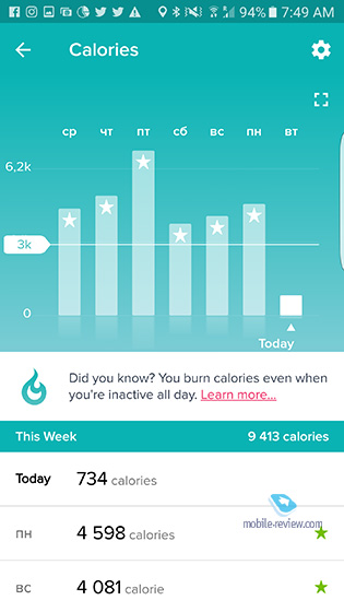 На сайте Fitbit вы можете просмотреть всю информацию о вашей активности в течение дня (и за другие периоды времени). Из дополнительных опций – возможность вводить данные о еде, а также вашем весе. И первая, и вторая опция для меня излишни, я не использую их. Возможно, что кто-то найдет их полезными. И теперь самое главное, это социальная составляющая. Вы можете добавлять других людей в друзья, видеть, сколько они прошли, многих это мотивирует на маленькие подвиги, особенно когда это хорошие знакомые. Точность измерения у шагомеров FitBit одна из лучших на рынке, их можно считать эталоном, почти нет ложных срабатываний. Новой функцией у трекеров FitBit в 2016 году стало напоминание о необходимости двигаться, оно ежечасное. Если вы неподвижны в течение 50 минут, то трекер мягко вибрирует и предлагает пройти 250 шагов. В софте учитывается, насколько вы соблюдали эти рекомендации, для суток приводится 9 часов. Считается, что неподвижность больше часа напрямую влияет на метаболизм, организм переходит в режим сохранения энергии.