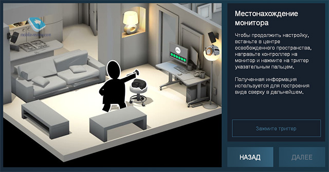 Достаточно серьезная игровая машина. Сам шлем выглядит, как большинство подобных устройств. На его корпусе расположены сенсоры (32), которые равномерно распределены по всей поверхности, в том числе на боках, на нижней и верхней гранях. Угол обзора – 110 градусов. У аппарата есть две линзы, фокусирующиеся на двух экранах с разрешением каждого 1200х1080 пикселей. Матрица линз – Amoled. Вероятно, использовали именно эту матрицу, чтобы черный цвет был черным, однако, как вы знаете, Amoled «славится» определенным строением пикселей – Pentile. Это строение, к сожалению, очень заметно, поэтому разрешение визуально становится меньше, чем 1200х1080. Низкое разрешение – основной недостаток HTC Vive. Однако для повышения разрешения необходимы не только новые дисплеи, но и производительная видеокарта, которая позволила бы выдавать 4К для каждого глаза выше 90 кадров в секунду. Идеальная ситуация, когда каждый экран получает разрешение не менее FullHD, а лучше больше. Здесь же стоит сказать о времени работы стиков. Мне хватало их на 4-5 часов. С одной стороны, немного, с другой – более 5 часов играть сложно, поскольку устают не только глаза, но и все тело в целом, так как приходится физически перемещаться по выделенному пространству. Заряжаются стики около 2-3-х часов – необходимый минимум времени для восстановления организма. Все остальное питается от сетевых адаптеров. Станции позиционирования синхронизируются беспроводным способом, их нужно только включить в розетку. Проводное соединение может потребоваться лишь в специальных случаях. Установка и настройкаДля начала вам потребуется выбрать место, где вы будете играть. Лучше всего выделить не менее 2.5x3.5 метра пустого пространства. На всякий случай убрать бьющиеся предметы, желательно закрыть зеркала и отключить яркие источники света. Использовал описанный выше компьютер MSI Vortex, подключил его к монитору моего ПК. Инсталлировал ПО и Steam. Далее собрал все необходимые элементы: