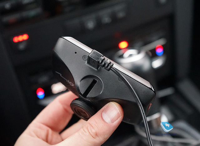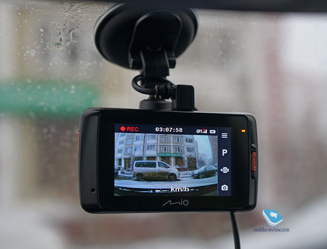 Лично мне нравится дизайн Mio, регистраторы очень простые, не вычурные, тут нет лишних деталей. Корпус из матового пластика, на нижней части – крепление для автомобильного держателя, почти всю заднюю часть занимает дисплей, рядом есть небольшой световой индикатор. Для зарядки и передачи данных используется разъем miniUSB, скорее это минус, сейчас распространены кабели microUSB. На левом торце находится кнопка включения, справа – россыпь кнопок, к ним мы еще вернемся. С установкой устройства в машине проблем не возникло, регистратор легко снять с крепления и убрать в бардачок или забрать с собой. Вот к чему есть вопрос – очень тугое крепление к держателю, чтобы изменить положение, нужно двигать с силой, но осторожно. Не забывайте, материал – пластик, не металл. Кабель от адаптера питания длинный, при желании можно его провести по салону. Этому способствует и расположение разъема miniUSB сверху, то есть кабель, выходящий сверху, будет легко подключить. В держателе с липучкой есть паз для укладки кабеля. Снять держатель легко, нужно сдвинуть скобу вниз и, потянув за силиконовый язычок, убрать присоску. В салоне автомобиля регистратор не привлекает особого внимания, при желании можно активировать хранитель экрана, тогда на дисплее отображаются только время, индикатор записи, скорость, при приближении к камерам появится уведомление.
