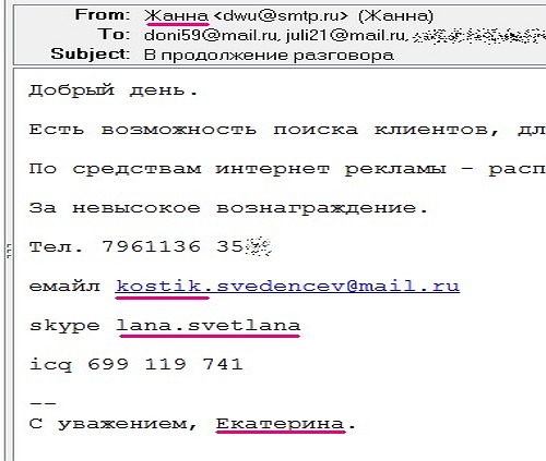 Написал для вас предупреждение и забыл об этом эпизоде, решив, что попался какой-то богатый и особенно «продвинутый» мошенник. А сейчас глянул — таких номеров на 8 800 используется полно, это уже целая криминальная индустрия с использованием арендуемых условно-стационарных номеров. Дорогое удовольствие? Это раньше было дорого, сейчас на удивление бюджетно. Например, в МТС месяц аренды такого бесплатного номера обойдётся в 1 700 руб., в эту плату включено ещё 500 минут входящих вызовов со всей России. Применительно к теме разговора — та самая анонимность, позволяющая арендовать телефонные номера, не опасаясь за собственное благополучие. Наверняка ведь люди жалуются и наверняка без последствий для воров, иначе явление не стало бы массовым. Посмотришь на такое, почитаешь длинные «простыни» жалоб пострадавших, и мысль об обязательной и достоверной идентификации перестаёт казаться признаком «тоталитарного государства». Про сетевую многоликостьРегулярно просматриваю даже подозрительную почту, боюсь пропустить важное письмо. Вот вам забавный образчик спама.