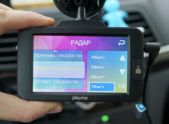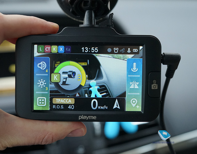 Выше, в характеристиках, вы можете посмотреть, в каких диапазонах работает радар-детектор, я катался и в Москве, и в Подмосковье, все камеры устройство определяет и предупреждает заблаговременно. Есть голосовые предупреждения об ограничении скорости, это удобно. Вот здесь можно посмотреть, как определяются две «Стрелки» подряд. Индикация на дисплее сделана занятно, на левой части дисплея – иконка камеры, причем эта иконка меняется, отображаются название диапазона и уровень мощности сигнала. Режимы стандартные, если выбрана «Трасса», детектируются все диапазоны, если «Город1», будет меньше срабатываний. Еще интересный режим «Смарт», это автоматический выбор режима в зависимости от скорости и местоположения (в гаджете зашиты координаты всех камер в городах-миллионниках, напомню, базу можно обновить). «Смартом» советую пользоваться, вещь хорошая. Ну и надо пояснить, Playme P500 Tetra «работает» с камерами не только посредством антенны, еще используется и база данных камер. Ультимативное решение.