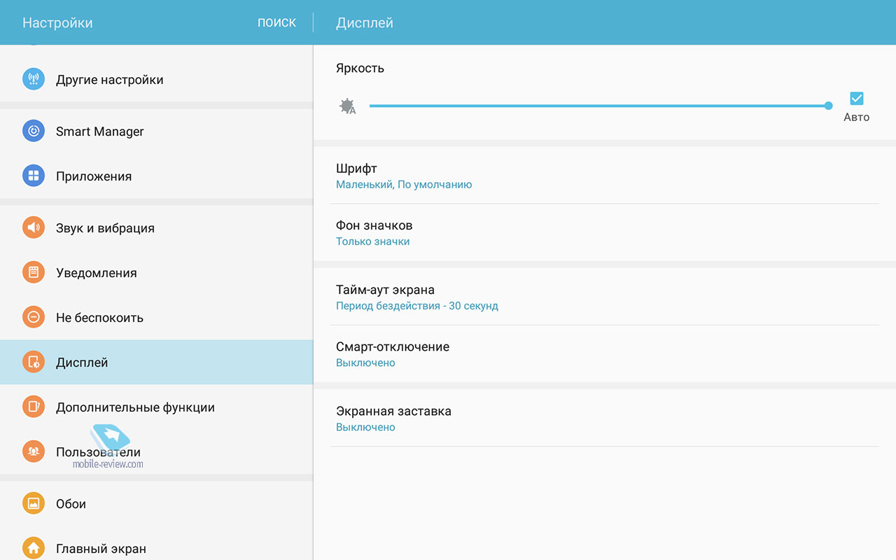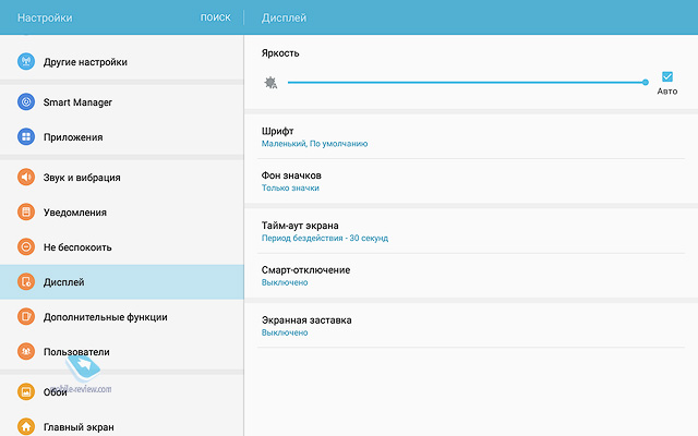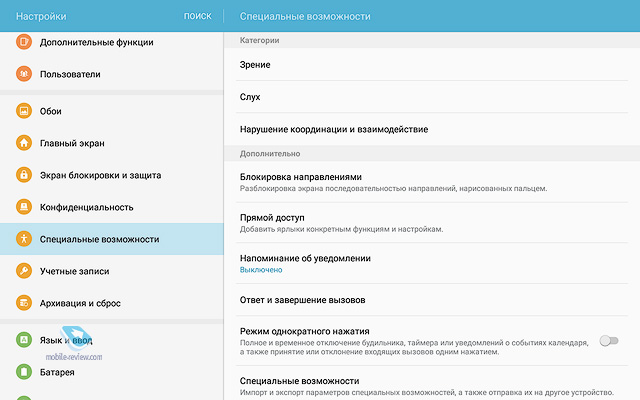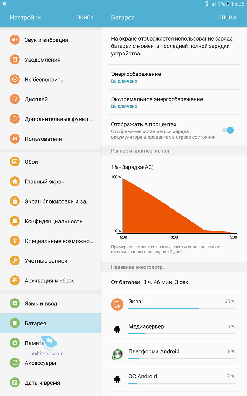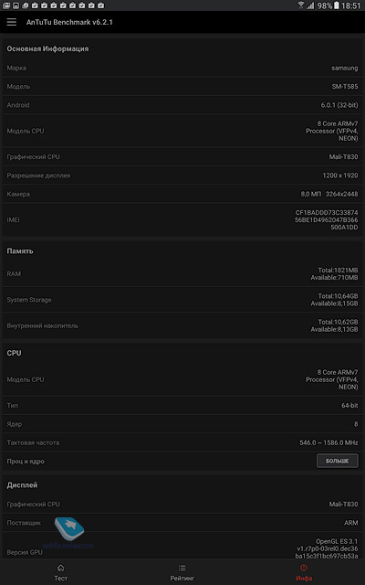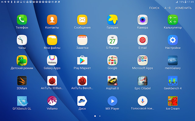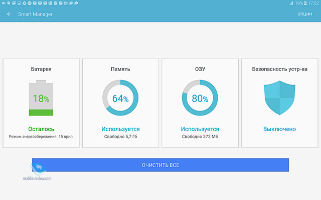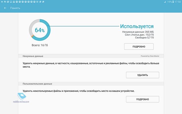 Никаких нареканий на качество сборки устройства нет, оно отлично, планшет будет иметь максимальный жизненный цикл, вы смените его через 4-5 лет, если только раньше не разобьете. ДисплейХарактеристики дисплея следующие - 10.1 дюйма, TFT IPS, 1920х1200 точек (224 ppi), 16:10, датчик освещенности. Экран очень неплохо в своем классе, он достаточно яркий и комфортный как в помещении, так и вне него. За месяц с планшетом никаких нареканий на его работу не возникло, дисплей адаптируется к разным условиям освещения. Чипсет, память, производительностьЧипсет Samsung Exynos 7870, 8 ядер Cortex А53 до 1.6 ГГц, графический сопроцессор Mali-T830MP2. Это очень неплохое решение, тем более, что выполнено оно по технологической норме 14 нм, что дает прирост во времени работы. Мне по производительности планшет показался золотой серединой, с одной стороны есть запас на будущее, это не бюджетное решение, с другой стороны, от одной зарядки он работает дольше всех конкурентов. Чем-то мне этот планшет напомнил смартфон Samsung J7 (2016), который также понравился продолжительной работой. Оперативной памяти 2 ГБ. Встроенной памяти 16 ГБ, пользователю доступно 10.5 ГБ. Посмотрите на результаты синтетических тестов. Можно установить карты памяти объемом до 200 ГБ, что неплохо. АккумуляторВ планшете стоит Li-Ion батарея емкостью 7300 мАч. Для нее заявлено время проигрывания видео до 13 часов (в реальности 9 часов на максимальной яркости). Полное время зарядки аккумулятора около 3.5 часов. У меня планшет работал значительно дольше, чем все аналоги, прирост минимум в полтора раза. Батарея является самой сильной стороной этого решения. Хотелось бы увидеть здесь быструю зарядку, но это уже из области мечтаний. В настройках вы можете найти режим энергосбережения, в том числе экстремального, но сильно эти режимы время работы не увеличивают, а вот скорость работы устройства падает заметно. КамераОсновная камера 8-мегапиксельная, качество снимков типично для планшетов, оно среднее. Зачем-то для камеры добавили вспышку. Рассматривать камеру как нечто серьезное нельзя, впрочем, посмотрите сами. Коммуникационные возможностиВ планшете есть поддержка USB on the GO, а версия USB 2.0. Версия BT 4.2. Для версии с SIM-картой поддерживается 4G, никаких проблем с работой на российских сетях нет. Отмечу, что планшет поддерживает ANT+, что необычно для таких решений. Программные особенностиВнутри стоит обычный Android 6, оболочка TouchWiz. Это типичный представитель планшетов от Samsung, есть разделение экрана на области, работа в нескольких окнах. Фирменный Детский режим доступен на всех планшетах Samsung, здесь он также есть. В этом режиме вы можете настроить планшет так, чтобы дети имели доступ только к ограниченному числу функций и приложений, вы также можете задать расписание. Очень хорошая программа, которая превращает планшеты Samsung при необходимости в детские устройства. Аналогичный софт, как правило, хуже и не бесплатен. Аналогично современным моделям появился Smart Manager, в котором можно посмотреть чем занята память, очистить ее, установить при необходимости антивирус. В разделе «Подарки» можно найти бесплатные приложения и подписку на разные сервисы. Самих подарков немного, и они на любителя. Для 4G-версии планшета будут также в наличии номеронабиратель плюс приложение для SMS. Этот планшет может выступать в качестве большого телефона, по нему можно говорить да