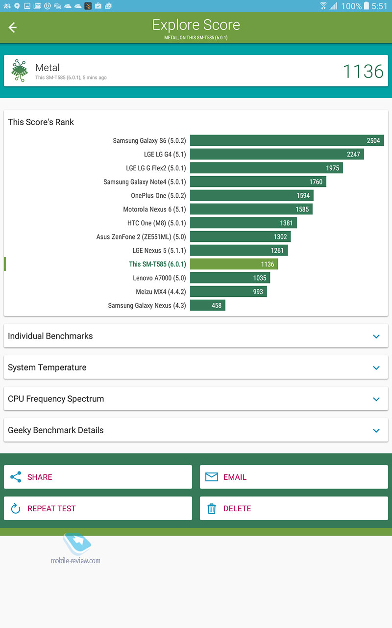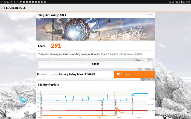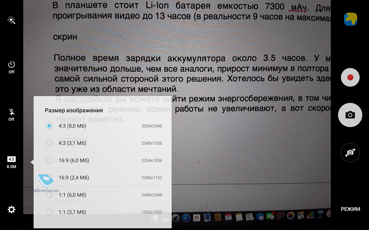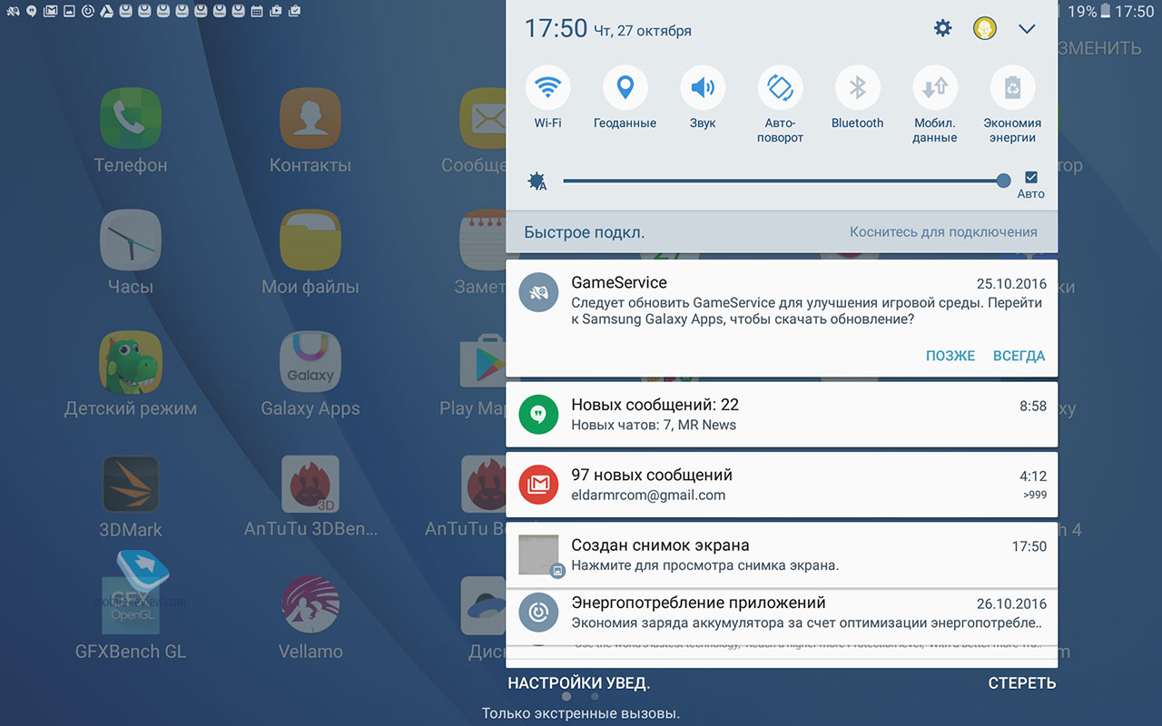 Никаких нареканий на качество сборки устройства нет, оно отлично, планшет будет иметь максимальный жизненный цикл, вы смените его через 4-5 лет, если только раньше не разобьете. ДисплейХарактеристики дисплея следующие - 10.1 дюйма, TFT IPS, 1920х1200 точек (224 ppi), 16:10, датчик освещенности. Экран очень неплохо в своем классе, он достаточно яркий и комфортный как в помещении, так и вне него. За месяц с планшетом никаких нареканий на его работу не возникло, дисплей адаптируется к разным условиям освещения. Чипсет, память, производительностьЧипсет Samsung Exynos 7870, 8 ядер Cortex А53 до 1.6 ГГц, графический сопроцессор Mali-T830MP2. Это очень неплохое решение, тем более, что выполнено оно по технологической норме 14 нм, что дает прирост во времени работы. Мне по производительности планшет показался золотой серединой, с одной стороны есть запас на будущее, это не бюджетное решение, с другой стороны, от одной зарядки он работает дольше всех конкурентов. Чем-то мне этот планшет напомнил смартфон Samsung J7 (2016), который также понравился продолжительной работой. Оперативной памяти 2 ГБ. Встроенной памяти 16 ГБ, пользователю доступно 10.5 ГБ. Посмотрите на результаты синтетических тестов. Можно установить карты памяти объемом до 200 ГБ, что неплохо. АккумуляторВ планшете стоит Li-Ion батарея емкостью 7300 мАч. Для нее заявлено время проигрывания видео до 13 часов (в реальности 9 часов на максимальной яркости). Полное время зарядки аккумулятора около 3.5 часов. У меня планшет работал значительно дольше, чем все аналоги, прирост минимум в полтора раза. Батарея является самой сильной стороной этого решения. Хотелось бы увидеть здесь быструю зарядку, но это уже из области мечтаний. В настройках вы можете найти режим энергосбережения, в том числе экстремального, но сильно эти режимы время работы не увеличивают, а вот скорость работы устройства падает заметно. КамераОсновная камера 8-мегапиксельная, качество снимков типично для планшетов, оно среднее. Зачем-то для камеры добавили вспышку. Рассматривать камеру как нечто серьезное нельзя, впрочем, посмотрите сами. Коммуникационные возможностиВ планшете есть поддержка USB on the GO, а версия USB 2.0. Версия BT 4.2. Для версии с SIM-картой поддерживается 4G, никаких проблем с работой на российских сетях нет. Отмечу, что планшет поддерживает ANT+, что необычно для таких решений. Программные особенностиВнутри стоит обычный Android 6, оболочка TouchWiz. Это типичный представитель планшетов от Samsung, есть разделение экрана на области, работа в нескольких окнах. Фирменный Детский режим доступен на всех планшетах Samsung, здесь он также есть. В этом режиме вы можете настроить планшет так, чтобы дети имели доступ только к ограниченному числу функций и приложений, вы также можете задать расписание. Очень хорошая программа, которая превращает планшеты Samsung при необходимости в детские устройства. Аналогичный софт, как правило, хуже и не бесплатен. Аналогично современным моделям появился Smart Manager, в котором можно посмотреть чем занята память, очистить ее, установить при необходимости антивирус. В разделе «Подарки» можно найти бесплатные приложения и подписку на разные сервисы. Самих подарков немного, и они на любителя. Для 4G-версии планшета будут также в наличии номеронабиратель плюс приложение для SMS. Этот планшет может выступать в качестве большого телефона, по нему можно говорить да