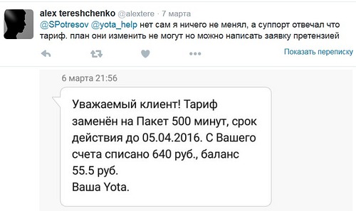 Ещё про такой вот «несчастный случай» мне написали. Человек уверяет, что сам ничего не делал и тариф через приложение не менял. Случайный сбой? Может быть. Также обратите внимание на первый абзац новости: «...с 1 марта 2016 г. на территории г. Москвы и Московской области вводятся новые улучшенные пакеты услуг — 500, 1000, 2000 и 3000 минут. Пакеты 100, 200, 400, 600 и 1200 минут прекращают свое действие». В тарифном калькуляторе на сайте Yota пакет 300 минут за 440 руб./месяц присутствует. В описании акции «Месяц бесплатно» для Москвы тоже фигурирует именно пакет 300 минут, в том числе в pdf-списке. Однако в новости этот пакет отсутствует, что меня настораживает. Могли, конечно, просто забыть написать цифру «300» в новости. А если не забыли? Логика в таком варианте есть, могли сделать пакет 300 минут только для «старых» абонентов и на один месяц для тех, кто подключится по акции до 30 апреля. Если так, то в Москве минимальный тариф Yota для смартфонов станет 640 вместо нынешних 440 руб. в месяц. Ничего не пытаюсь утверждать, но с нашими операторами не всегда поймёшь, где кончается разгильдяйство и начинается интрига. Изменения для планшетовСобственно новость: