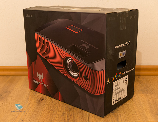 Кроме незначительности минусов, обнаруживаются у проекторов и серьезные плюсы: Мобильность. Вам удалось купить плазменную панель с диагональю в 65 дюймов и повесить её на стену, не обрушив панельную девятиэтажку до основания? Поздравляем! Теперь попробуйте аккуратно перевезти её на новый адрес («как это, не влезает в багажник моего Mini Cooper?!»), не разбить, затащить в лифт и повесить заново. Ой, здесь стена на 5 сантиметров уже? Ой, она гипсовая и не выдержит? Увы, вариантов два — продать панель на «Авито» или искать другую квартиру. Проектор же сочетанием удаленности от экрана и настроек zoom-кольца даст вам любой необходимый размер изображения с точностью до миллиметра. А вес в 3 килограмма и сумма всех габаритов в среднем около 60 сантиметров позволяет положить проектор в наплечную сумку (которая нередко к нему прилагается) и перенести любым удобным способом. Масштаб. У многих семей и дружеских компаний принято собираться перед телевизором для совместных кинопросмотров или игр, но это и близко не сравнимо с ощущениями, которые получаешь от проектора. Зрелищные игры сразу для нескольких игроков типа Mortal Kombat немедленно затягивают с головой и зрителей, и участников. А приглашая дюжину друзей посмотреть летний блокбастер, чувствуешь себя хозяином полноценного кинотеатра, только без рекламных роликов и сомнительных незнакомцев вокруг. Хоть плату за вход собирай! И, конечно, цена в пересчёте на дюйм изображения. Как и у любых устройств, разница между самыми дешевыми и самыми дорогими моделями огромна, но качественные модели массового «домашнего» сегмента легко вписываются в бюджет $1500-2000. Самый крупный телевизор, который мне предложил Яндекс.Маркет за эти деньги, имеет диагональ в 65 дюймов, то есть с расстояния трёх метров ощущается примерно как 13-дюймовый ноутбук при работе за ним. На режим полного погружения — не тянет. Acer Predator Z650По типу использования проекторы обычно делятся на офисные, инсталляционные и проекторы для домашних кинотеатров. Acer позиционирует свой Predator Z650 как игровой. Попробуем понять, действительно ли актуальна эта попытка отстроиться от конкурентов, или же она в большей степени является уловкой маркетологов. Но, прежде чем заглянуть в коробку, посмотрим на ключевые характеристики и определимся, что они означают. Проекционная технология — DLP (Digital Light Processing). Максимальное разрешение проектора — 1920х1080 пикселей. Яркость — 2 200 люмен. Отношение расстояния к размеру изображения — 0.69:1 - 0.76:1. Кроме того, она означает, что для получения крупного изображения проектор может находиться достаточно близко к экрану и обладать для аналогичной яркости картинки меньшей светосилой, чем длиннофокусный. В этом контексте показатель яркости в 2 200 люмен весьма неплох. Для длиннофокусного он был бы среднестатистическим. Звук — два 10-ваттных громкоговорителя с поддержкой DTS. Возможность трансляции звука по Bluetooth. Цветовое пространство — 100% отображение sRGB. Еще одна функция, наличием которой хвастается проектор еще с порога — это возможность установки WirelessHD-донгла прямо в корпус проектора (предусмотрен соответствующий разъём под верхней крышкой), однако в комплектацию нашей модели устройство не входит. А вот что входит. Комплектация