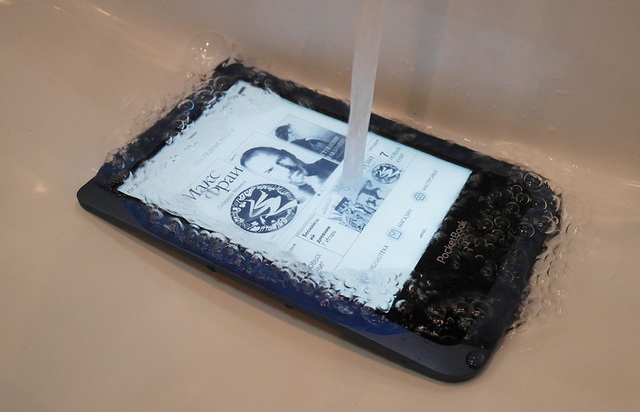 Правда, здесь есть один очень тонкий момент. Защита ридеров может быть реализована по-разному. Нередко производители называют защищенными модели, которые на самом деле способны противостоять только брызгам воды. Тогда как никакой полноценной защиты от жидкостей в них нет. О наличии такой защиты (а значит, и о полной 100% герметичности корпуса) говорит соответствие читалки стандарту семейства IP. На российском рынке есть только один защищенный по IP57 ридер – это PocketBook 641 Aqua 2 (на фото ниже). Его можно окунать в воду на глубину до одного метра, а еще он не боится пыли и прочих твердых частиц – корпус этого ридера полностью герметичен. Другие модели, повторимся, стандартам IP на деле не соответствуют. Они не герметичны – защита от воды реализована на уровне обработки платы специальным гелем. И поэтому они безразличны лишь к брызгам. Против каких-нибудь загрязнений органического происхождения (супа, сока, чая и т.д.), эти электронные книги бессильны. Так что ничего лучше и надежнее полной герметизации корпуса для защиты «внутренностей» ридера пока еще не придумали.