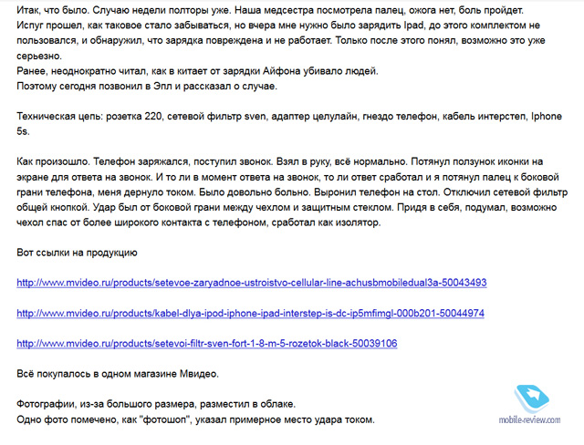 Основная мысль, которую хочу донести до вас, проста как пять копеек – зачастую мы сами открываем ворота для злоумышленников, когда не думая жмем на кнопки и пытаемся быстро решить проблему. Быстрота нужна только при ловле блох, во всех остальных случаях стоит остановиться и подумать, что именно происходит, почитать про аналогичные случаи в сети. Уверен, что вы найдете массу примеров и описания того, как другие люди действовали в подобных ситуациях. Удар током iPhone – письмо нашего читателяОдин из наших читателей Роман Богаченков рассказал свою историю о том, как он купил зарядку для iPhone, а она ударила его током.