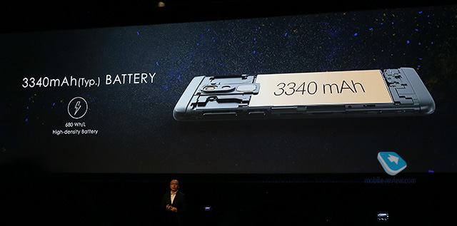 Батарейка встроенная 3340 мАч, есть быстрая зарядка. Отдельно привели сравнение с iPhone 6 Plus, согласно которому модель от Apple в большинстве режимов проигрывает.