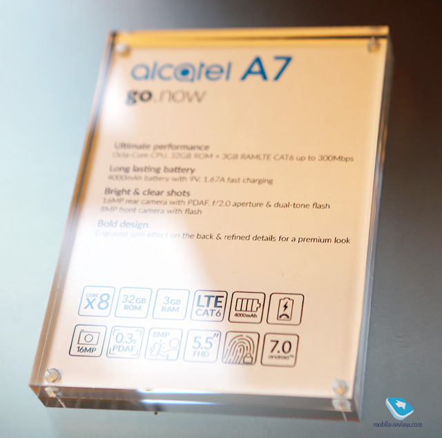 Осталось сказать, что экран 5.2 дюйма с FullHD-разрешением, ламинацией, а датчик отпечатка расположился сзади. Мне аппарат показался обычным, за исключением звука. Будет интересно услышать, что вы думаете про него. Жаль, что выбора в виде 5s не будет, но на него цена получалась бы кусачей, в Европе стоимость 299 евро. Удивительно, но на фоне Idol 5 интересно выглядит фаблет А7, который появляется в октябре и ровно по той же цене – 13 990 рублей. Впрочем, посмотрите сами - у этого аппарата FullHD экран в 5.5 дюйма (но нет 2.5D-стекла), датчик отпечатка также на спинке, зато батарея на 4000 мАч и быстрая зарядка (меньше 2.5 часа до 100 процентов). Чипсет MediaTek 6750T, это восемь ядер (4х1.5 ГГц, 4х1 ГГц). Интересно, что LTE cat. 6, в отличие от обычного Idol 5. Присутствует NFC. Память 3/32 ГБ, но карты памяти только до 32 ГБ, что можно считать неудачным решением. Фронтальная камера 8 мегапикселей, основная – 16 мегапикселей (сенсор 1/3, f/2.0, PDAF).
