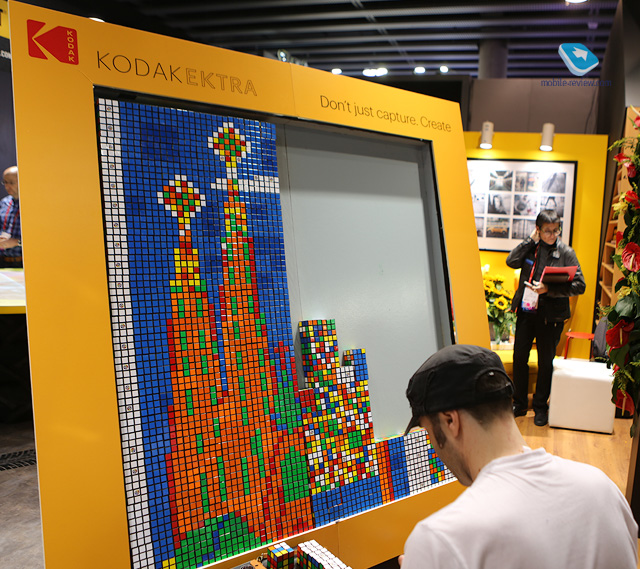 На стендах много всяческих развлечений, но меня поразил только один аттракцион: из кубиков Рубика собирают картину, надо правильно собрать кубик, смотря на экране телефона картинку, чтобы сделать часть большого полотна. Очень крутая идея и реализация, завораживает.