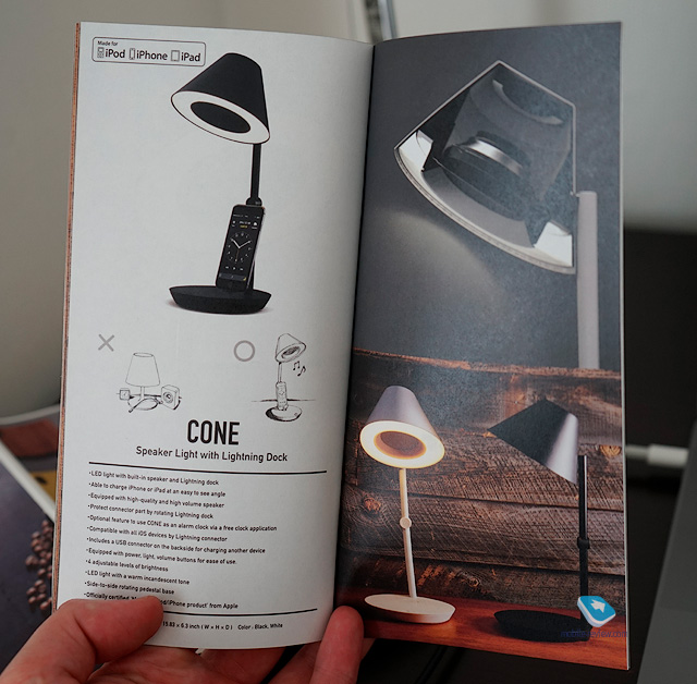 Аксессуары NuAnsТут мне понравилось какое-то очень упорное внимание к деталям. Ворсистый коврик для смартфона: положили, заряжается, чтобы после кабель не сполз вниз, есть металлический кругляшок-магнит. Прикрепили кабель, и он не сползет. Лампа со штекером Lightning (может быть любой другой), когда штекер не нужен, его можно спрятать. Лампа со встроенной колонкой, док-станцией, своим приложением, где вы можете смотреть время, погоду. Маленький внешний аккумулятор, где полоски кожи разворачиваются в миниатюрный коврик со спрятанным штекером Lightning.