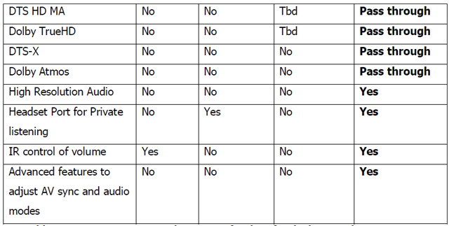 Чипсет справляется с 4K видео H.265, VP9 и частотой смены кадров 60 fps, 4K x 2K с частотой 60 Гц, 1080p с частотой 120 Гц. Ниже – две таблицы с возможностями приставки и сравнение с ближайшими конкурентами:
