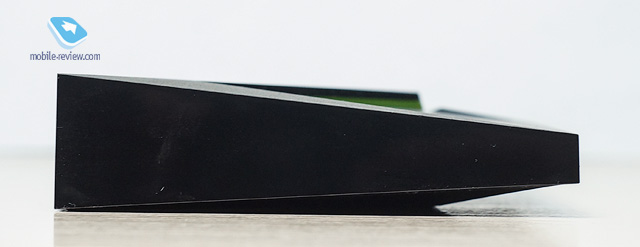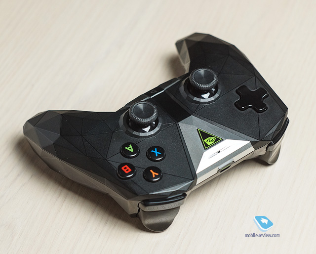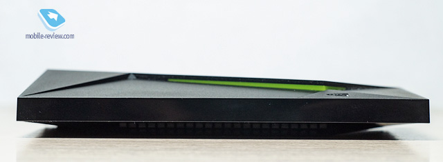 Док-станцию Shield Stand необходимо приобретать отдельно. Устройство и аксессуары к нему будут продаваться только и исключительно на сайте NVIDIA в разделе «Купить». Внешний вид приставки, контроллера и пульта управленияТелевизионных приставок на тесте у меня было достаточно много, и все они, как правило, выглядели одинаково: либо прямоугольная коробка, либо овальная типа Xiaomi Mi TV. В устройстве NVIDIA Shield пошли по чуть более оригинальному пути: форму сложно назвать правильной прямоугольной, она как будто визуально перекошена на бок; состоит из отдельных неравнобедренных треугольников, которые расположены где-то выше, где-то ниже. БОльший треугольник имеет глянцевое покрытие, остальная часть верхней панели матовая. Под этим треугольником имеется вставка зеленого цвета. При включении гаджета она подсвечивается. Смотрится очень оригинально и симпатично. Справа внизу выдавлен глянцевый логотип NVIDIA. Боковые грани глянцевые. Откровенно говоря, я противник глянцевых поверхностей в подобных вещах: так или иначе, поверхность быстро будет покрываться пылью, другими следами, царапины будут заметнее и так далее.