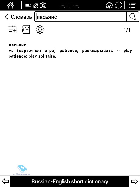 Из минусов отмечу замысловатый доступ к словарю: вам нужно сначала нажать кнопку «Меню», затем выбрать иконку словаря, после этого выделить слово, и только потом откроется перевод.
