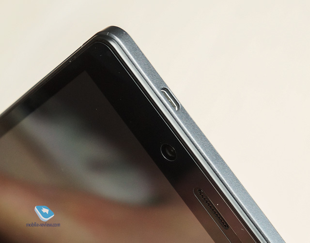 Боковые грани ровные, ближе к лицевой и тыльной частям имеют срезы со шлифовкой. В целом, планшет производит впечатление прочного гаджета без каких-либо конструктивных проблем. Сверху расположены: индикатор пропущенных событий, фронтальная камера, датчик приближения (откровенно говоря, нечасто они встречаются в подобных аппаратах), датчик освещения, что тоже хорошо, разговорный динамик (в меру громкий, звук немного гулковатый, слышно достаточно четко). На нижнем торце слева – спикер громкой связи, справа – микрофон и второй динамик.
