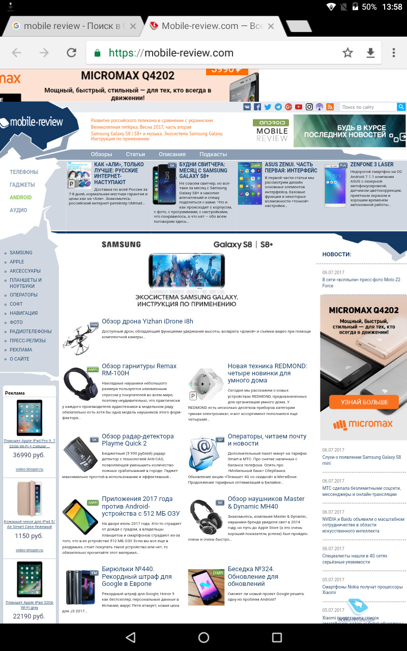 В сравнении с Apple iPhone 5 ДисплейВ данной модели TLE821L установлен экран, диагональ которого составляет 8 дюймов. Матрица выполнена по технологии IPS, разрешение – 1280x800 точек (WXGA, чуть больше, чем HD). Пикселизация, конечно же, заметна, но для тех целей, для которых будет приобретаться планшет, это вряд ли будет особенно критично. Яркость подсветки – около 300 единиц, контрастность – около 750:1. Для планшета эти параметры вполне нормальные. Углы обзора максимальные, под наклонами экрана картинка не искажается, не фиолетит и не желтит. Цветопередача естественная. На солнце картинка читается с трудом, в тени все более-менее нормально. Тачскрин поддерживает до пяти одновременных касаний.