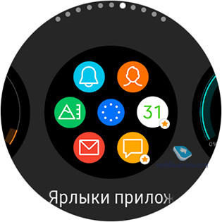 В круговое меню для приложений можно попасть, нажав нижнюю кнопку, выход на уровень вверх осуществляется верхней клавишей. В меню располагаются ваши приложения, причем кругов с ними может быть несколько. Вы сами сортируете, куда и как поместить ярлыки, чтобы вам было удобно.