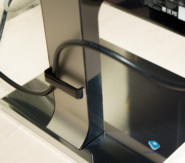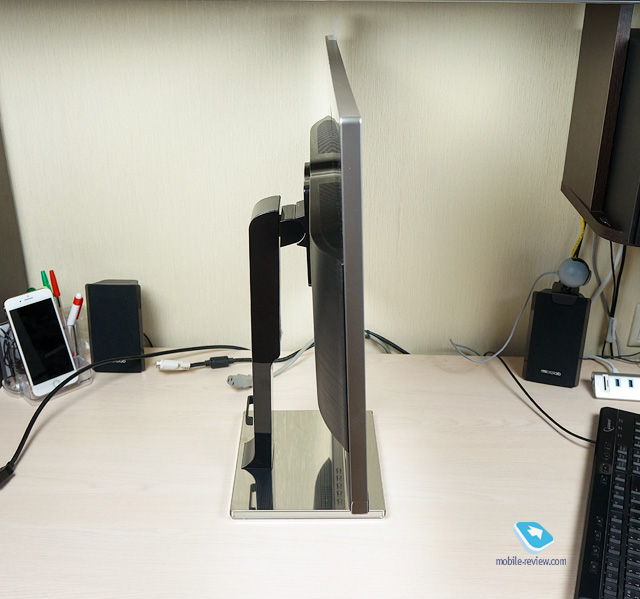 У монитора имеется крупная квадратная подставка из металла и пластика. Сверху покрытие сделано под шлифованный металл, покрытие маркое – лихо собирает отпечатки пальцев. На дне есть колесики для поворота корпуса по кругу на 360 градусов.