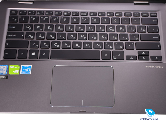 Справа от тачпада под кнопками стрелок притаилась надпись harman/kardon. По периметру крышки находятся резиновые полоски, призванные защищать экран от клавиатуры.