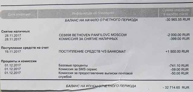 Абонплата 50 руб./месяц за то, что «Почта России» шлёт выписку «на деревню дедушке». Конечно же, на «Почте России» не могли заподозрить того, что указанного адреса не существует. В банке тоже соответствующего софта нет, а доступ в интернет у работников банка заблокирован. Во избежание, так сказать... Снятие денег со счёта клиента за услугу, которую невозможно оказать, отнюдь не заблокировано, кто бы сомневался. И правильно! Небось, банк — не «Мосэнерго», которое кормит народ электричеством в кредит, а потом ещё и счёт присылает бесплатно. Дёрнулся человек снять 2 000 руб. наличными — списали 400 руб. «комиссии». И это явно не проценты, нет. Проценты — само собой и отдельно. 20% от суммы сняли с ходу за ласковое урчание моторчика банкомата. В общем, при суммарной задолженности порядка 30 000 руб. человек заплатит в месяц 1 249 руб. дополнительных процентов и комиссий. В месяц! И это прекрасный, дисциплинированный заёмщик, в распечатке ноль штрафов, ноль неустоек. А если бы, не дай боже, поверх этого были бы штрафы за просрочки или ещё чего? Я уже молчу про покупки/операции, которые деньги на счёте карты блокируют сразу, а вот в банковский биллинг попадают далеко за пределами grace period. Отставание 3-5 дней — обычное дело. Клиенты об этом догадываются? Сомневаюсь. Начинаю понимать, на чём наши банки так хорошо зарабатывают и почему так активно рекламируют свои карты. РезюмеЯ категорически, руками и ногами «за» кредитные карты. Они удобны, практичны, экономят массу времени, нервов и прочее, прочее. И даже деньги экономят (я не только про кэшбэк). Скажем, посидеть с девушкой в кафе, дать официанту карту и 100-150 руб. «живыми» деньгами – выбор ваш, и все довольны. Дать официанту пару тысяч и услышать «ой, а у меня нет сдачи, посидите, пока разменяю!» – право выбора вы сами передали официанту, и он этим правом успешно воспользовался. Шутки шутками (во всякой шутке есть только доля шутки), но жить нынче без карты совсем некомфортно. Просто нужно понимать, что кредитная карта — прежде всего средство платежа online и offline, не более того. Инструмент. А не второй (третий, четвёртый...) кошелёк в кармане, который вы получили от банка за скромную ежемесячную плату. Плата, скорее всего, окажется нескромной, а то и непомерной. Писать об этом в предновогодне-подарочной лихорадке было бы абсурдно, но сейчас как раз неплохое время сесть, посчитать и задуматься. А если у вас осталось некоторое количество свободных денег, то почему бы не инвестировать их в настольный калькулятор и большую лупу для чтения мелкого шрифта договоров? Только не в кредит, умоляю! А то мне вон Яндекс.Директ прислал рекламу пуховика всего-то за 240 руб./месяц «беспроцентного» кредита. Куртку-дождевик или зонтик за 90-100 руб./месяц пока не предложил, плохо интегрирован Яндекс.Директ с Яндекс.Погода? P.S.Взял кредитку одного банка, зачем — черт меня знает. Наверное, освоиться в самых современных online-механизмах взаимодействия с клиентом, интересно ведь! До новогодних празднований было как-то не до карты, суета, сами понимаете. Так аккурат дня за три до наступления расчетной даты получил жалостливое СМС на тему: «Что же вы нами не пользуетесь-то? Мы хорошие! Скорее в магазин за покупками!». Вот это и был «контрольный выстрел в голову», который сподвиг меня дописать этот текст. Отличный тайминг СМС-сообщения от банка, бесспорно. С