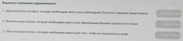 Лично я всегда погашал полную сумму задолженности, не вдаваясь в прочие подробности. Поговорил со спецами, и, оказывается, 90% пользователей карт платят только так называемый «минимальный платёж», сумму которого банк заботливо указывает в СМС-рассылке. В этом случае активно рекламируемый grace period может не действовать — какая приятная неожиданность! Уточняйте в своём банке. А ещё, оказывается, существует «обязательный платёж», который даже меньше «минимального платежа»! С повышенными процентами, что ли? Ух, как у них всё непросто... Непросто, но наверняка выгодно банку.