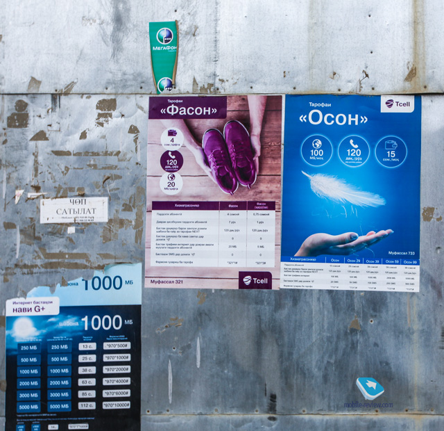 На дверях - реклама текущих тарифных планов, один из самых популярных стоит сто сомов, это порядка 10 долларов, что для Таджикистана очень дорого. Но преимущества в интернет-трафике, бесплатных социальных сетях, многие выбирают этот тариф.