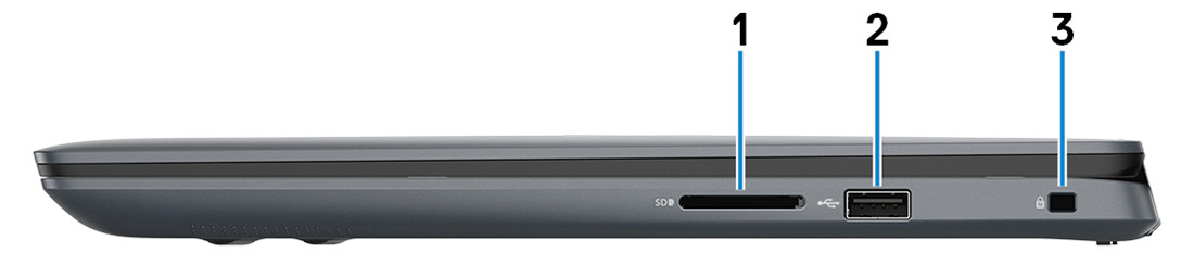 С правой стороны находятся: 1. Карта памяти SD, 2. Порт USB 2.0, 3. Гнездо для клинового замка
