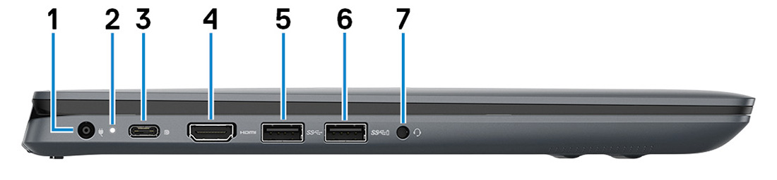 С левой стороны портов побольше: 1. Разъем питания, 2. Индикатор заряда батареи, 3. USB 3.1 Gen 1 Type C™ (DP/PowerDelivery), 4. HDMI 1.4b, 5. Порт USB 3.1 1-го поколения, 6. Порт USB 3.1 Gen 1, 7. Универсальный аудиоразъём 3.5 мм.