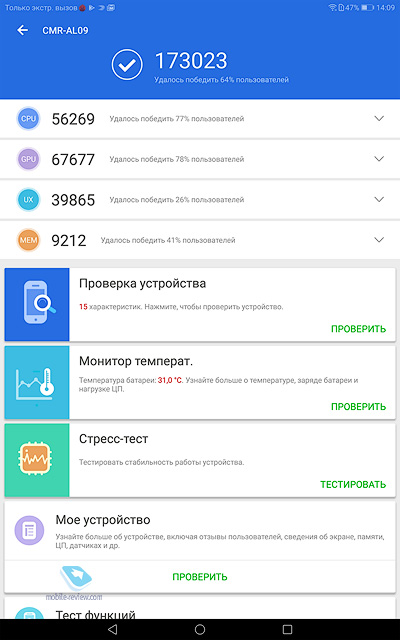 Старшая модель продается в конфигурации 4/32 (только Wi-Fi) и 4/64 ГБ. У нас была последняя версия. Скорость ОЗУ – 5100 МБ/с – хороший результат, но ниже, чем младшей модели. Скорость встроенной памяти – 105/40 – крайне низкий результат. Обычно подобные цифры показывают бюджетные смартфоны за 4 000 – 5 000 рублей. И там и там используется один и тот же процессор собственного производства HiSilicon Kirin 960 (4x2.36 ГГц Cortex-A73 + 4x1.8 ГГц Cortex-A53), графика Mali-G71 MP8. Немного странно видеть в 2018 году процессор, который представили еще в 2016 году. Скорее всего, таким образом компания Huawei решила сэкономить на железе, дабы удешевить производство планшетов. В целом, ход верный: чип вполне «бодрый», а обойдется компании в копейки. В Antutu оба аппарата набирают по 170 000 – 180 000 баллов. За время тестирования никаких лагов или глюков я не наблюдал. Для тестирования производительности в играх выбрал ShadowGun Legends и простенькую, но красочную Cover Fire. Обе игры идут на максимальных настройках – «Ультра, 60 FPS». В качестве операционной системы используется Google Android версии 8.0 и фирменная оболочка EMUI 8.0. Ничего нового добавить об EMUI не могу: на ней выходили десятки моделей, о которых мы подробно рассказывали. Среди программного обеспечения Huawei установила какие-то простенькие детские игрушки. В папку «Инструменты» поместила следующее: погоду, калькулятор, диктофон, часы, телефон и контакты, сообщения, музыку, видео, HI Care, компас, создание резервной копии, Phone Clone и приложение Quik.