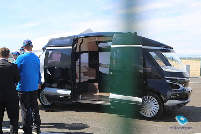В номенклатуре от КамАЗ машина получила номер 1221, это категория БТС-М2, транспортное средство особо малого размера. Оно может вмещать до 12 человек, причем внутренняя компоновка осталась как в предыдущей разработке: два дивана по краям, центральное пространство не занято ничем. Разработчики говорят, что это прототип и компоновка может и должна меняться под конкретные задачи, тут нет сомнений в том, что это не финальный вариант.