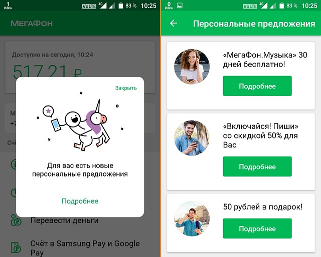 Как я погляжу, выдача персональных предложений через интерфейсы «фирменных» приложений для смартфонов становится модным трендом, если даже консервативные банки пробуют такой подход вместо традиционных SMS. В «МегаФоне» предлагают всякое-разное: тут и бессрочные (!) скидки до 50% на абонентскую плату, и разовые дарения виртуальных рублей за пополнение баланса, и порции интернет-трафика, и многое другое.