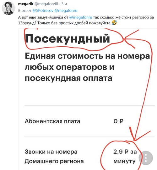 Что касается принудительного перевода абонентов на другой тариф, то нынче таким грешат все операторы, с этим ничего не поделаешь. Я только не понимаю, почему в МегаФоне методично занимаются отрубанием собачьего хвоста по кускам. Ну, устроили «тарифный шабаш», народ дружно взвыл, и через некоторое время всё затихло. Однако, судя по моим многочисленным письмам и комментариям, процесс изрядно растянулся во времени. Постоянно что-то кому-то меняют, что-то отключают-подключают, и люди постоянно жалуются на свою нелегкую тарифную судьбу. Как-то неправильно это с точки зрения работы оператора над своим имиджем. «Посекундный»Прислали мне скриншот в твиттере, мелочь, но забавно. Описание тарифа здесь.