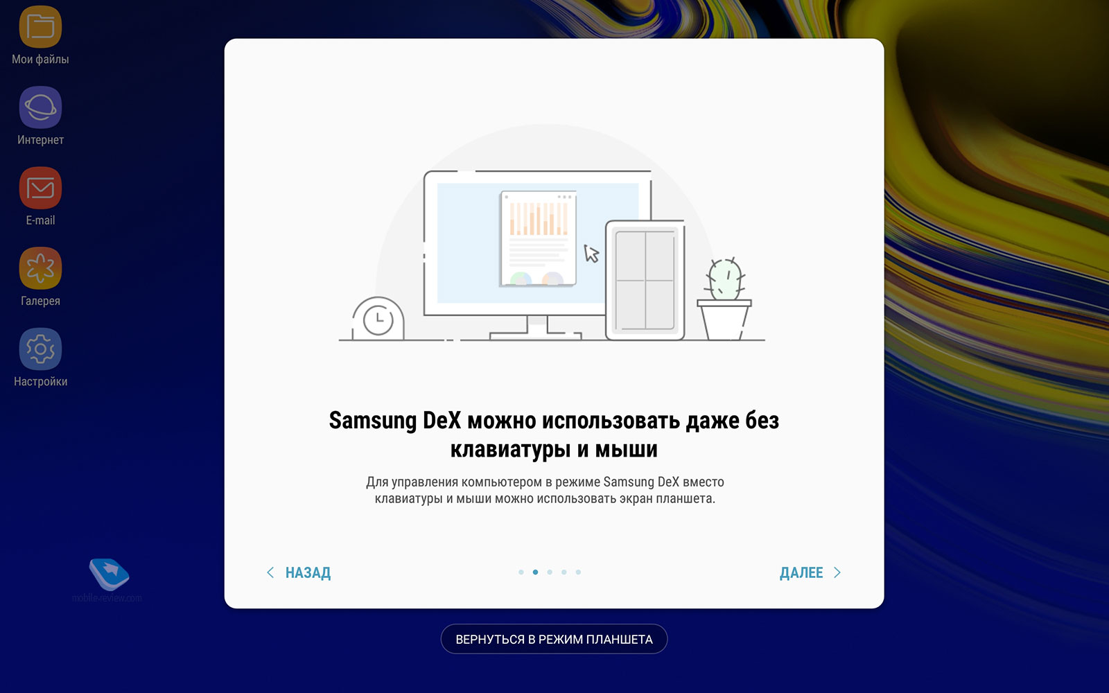 Сильная сторона Dex – это знакомый интерфейс, позволяющий привычно работать с окнами: открывать, сворачивать, перетаскивать файлы и т.д. При этом на планшете любое приложение в режиме Dex можно вывести на весь экран, в то время как на телефонах в этом пункте ещё есть ограничения. Уникальная фишка Dex на планшете — это возможность подключить внешний монитор, на котором как раз и будет Dex-режим, в то время как на экране планшета будет Android-интерфейс, работающий независимо. Таким образом, получается двухэкранный режим работы. Например, на внешнем мониторе показываете презентацию, а на планшете делаете пометки или играете в танчики.