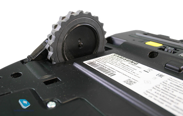 Спереди находится резиновая самоочищающаяся щетка, а под ней – отверстие пылевсоса. У щётки крупные щетинки, поэтому на ней не может скапливаться или налипать мусор. Она легко вынимается, нужно лишь сдвинуть жёлтые защёлки. Щётку тоже можно промывать под водой, хотя это необязательно. Рядом находятся площадки для подключения к док-станции.
