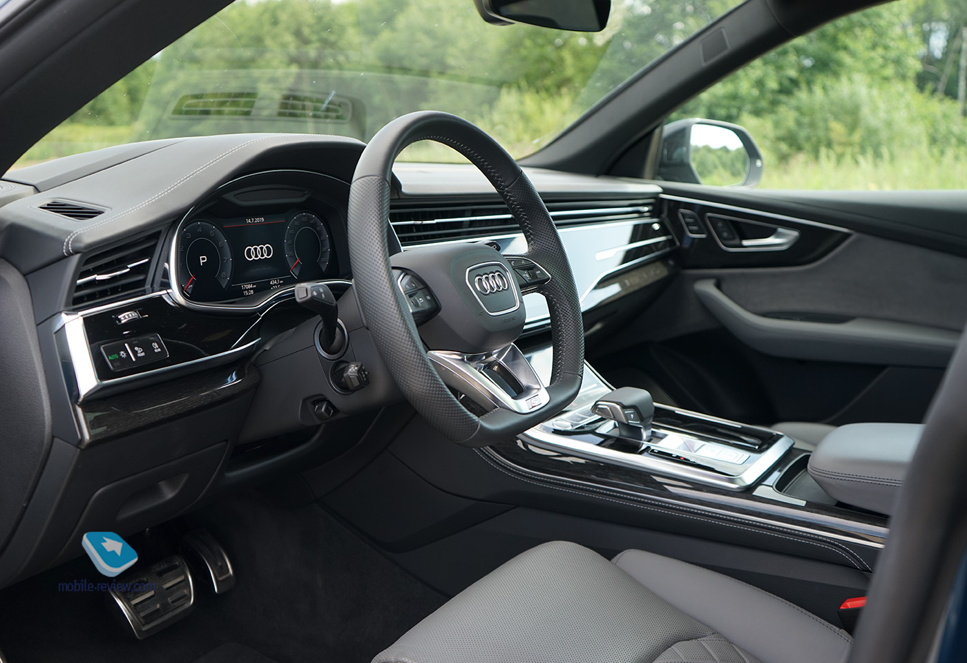 По посадке в автомобиль нет никаких претензий, двери закрывают пороги, так что они всегда остаются чистыми. Посадка достаточно высокая, обзор хороший, зеркала как у Q7, большие и дают хороший обзор. Усесться за рулем с комфортом смогут люди любой комплекции, особенно если, как и в тестовом автомобиле, будут установлены спортивные кресла с полным набором электрорегулировок, включая регулировку боковой поддержки, длины подушки и поясничного подпора в четырех направлениях. Вообще, кресла классные, особенно когда настроишь их под себя, я чуть зажимал себе боковую поддержку, вытягивал в полную длину подушку и мог ездить в Q8 часами, не уставая. К сожалению, со стандартными сидениями познакомиться не удалось, но в Q7 была такая возможность, и, на мой взгляд, они ненамного проигрывают по комфорту спортивным креслам.